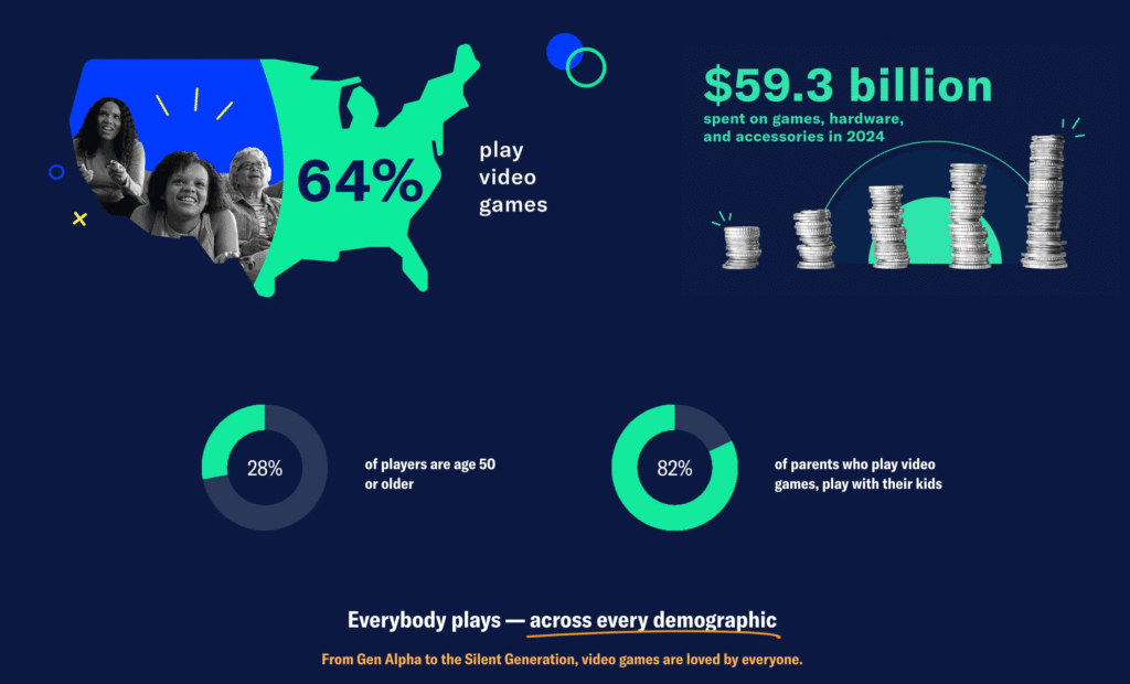 • The 2025 ESA report confirms gaming is mainstream and intergenerational.